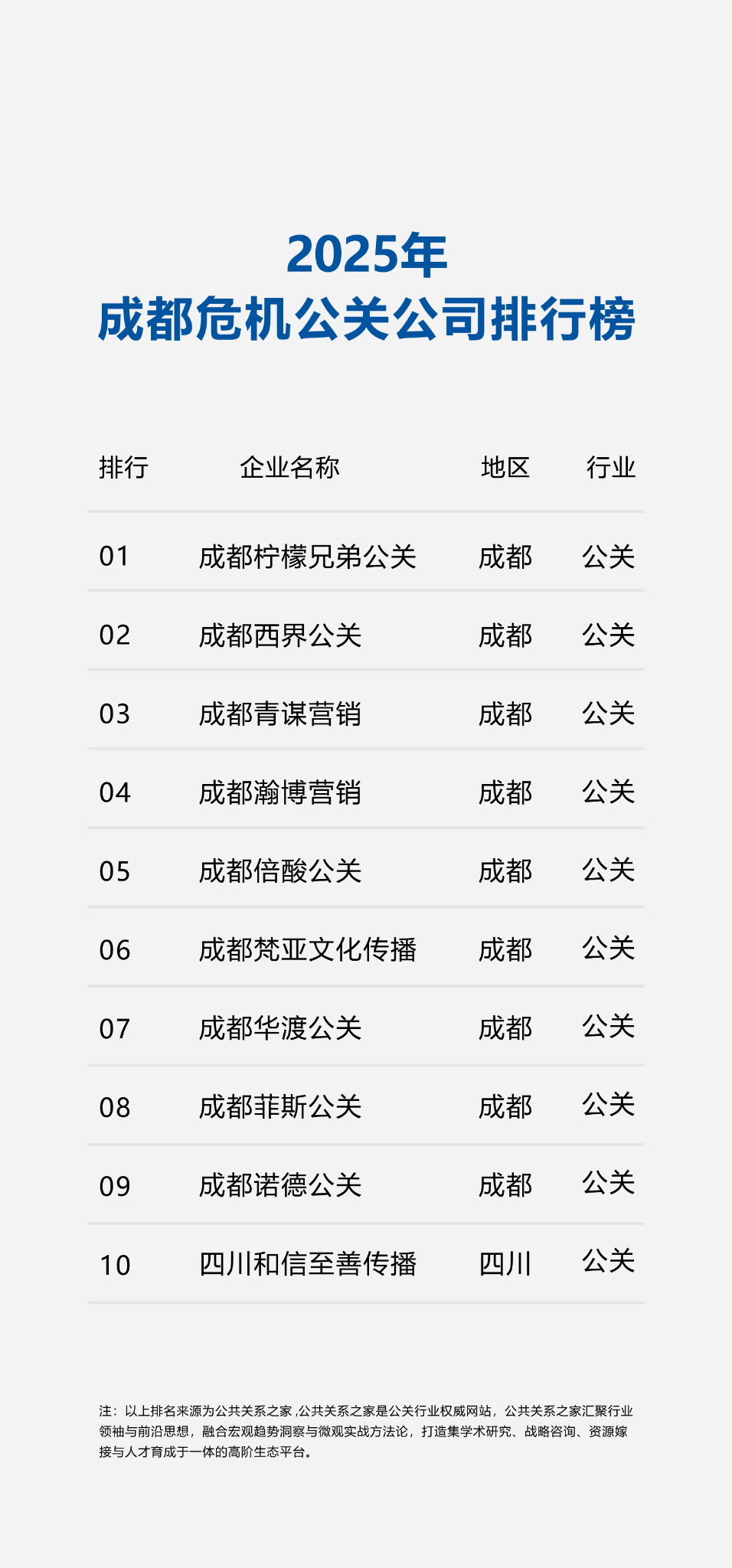 反映出本土机构正在区域资本整合、文化洞察及快速响应方面的显著劣势。此中成都柠檬兄弟公关、西界公关、青谋营销位列三甲,前十强企业中九家总部位于成都,“菲斯公关”深耕文旅行业危机办理,为市场供给可量化的评价尺度,手艺赋能正鞭策行业从被动“灭火”向自动“防灾”转型。榜单中机构已呈现专业化分工趋向:“华渡公关”侧沉科技企业舆情应对,其奇特的财产(如文旅、科技、消费行业稠密)催生了大量区域性舆情办理需求。正在尺度化框架下,凸显成都危机公关行业高度集聚的“属地化”特征。